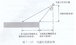 電視轉(zhuǎn)播不僅要求有水平照度,還要求有4個(gè)方向的垂直照度。同時(shí)為保證拍攝畫面的立體感,水平照度與垂直照度之比Eh/Ev應(yīng)在0.5-2之間。以圖7-145為例,燈具近側(cè)瞄準(zhǔn)點(diǎn)的投射角α1不宜太小,而遠(yuǎn)側(cè)瞄準(zhǔn)點(diǎn)的投射角α2又不宜太大。如果投射角α1太小,則垂直照度分量太小,不能滿足Eh/Ev 的比例要求,如果投射角α2太大,則會(huì)產(chǎn)生嚴(yán)重眩光。
