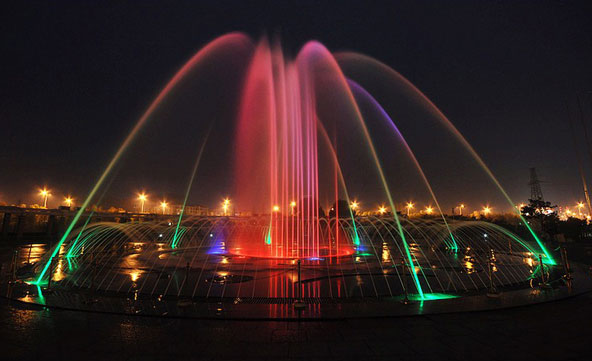 噴泉是富于動(dòng)態(tài),集聲、光、色、形于一體的設(shè)施。其中,光與色是同步產(chǎn)生和消失的,色必須通過(guò)光束才能表現(xiàn)出來(lái)。因此,應(yīng)將色與光同時(shí)考慮,統(tǒng)一安排。