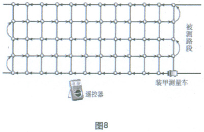 本方案是將具有記憶和存貯功能的TES-1333型照度記安置在高檔電動遙控的履帶式玩具裝甲車(以下簡稱為測試小車)上,該測試小車的驅(qū)動系統(tǒng)受站在路邊的測量者手中的遙控器和測試小車內(nèi)安置的可編程控制器為主體的自動控制系統(tǒng)控制,當車內(nèi)的自動控制系統(tǒng)啟動時,裝甲車將按照事先設定的動作程序沿如圖8所示的箭頭方向完成行走程序,并采用四點法在每個矩形網(wǎng)格的四角處自動完成照度測量和記錄,存貯任務,待全部程序結(jié)束后,測試小車在遙控器的操縱下自動返回測量者所在位置。遙控器的另一作用是在車內(nèi)控制系統(tǒng)失靈的情況下,由測量者手動遙控完成全部的測量過程,并在道路出現(xiàn)行駛車輛時緊急召回測試小車。