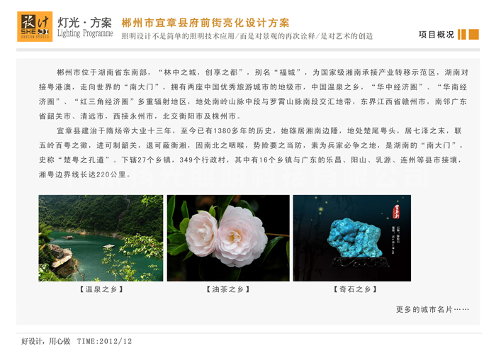 府前街位于郴州宜章縣,本次亮化工程設(shè)計(jì)施工具體指宜章府前街兩邊建筑照明設(shè)計(jì),包括住宅建筑,商業(yè)建筑,行政建筑.....